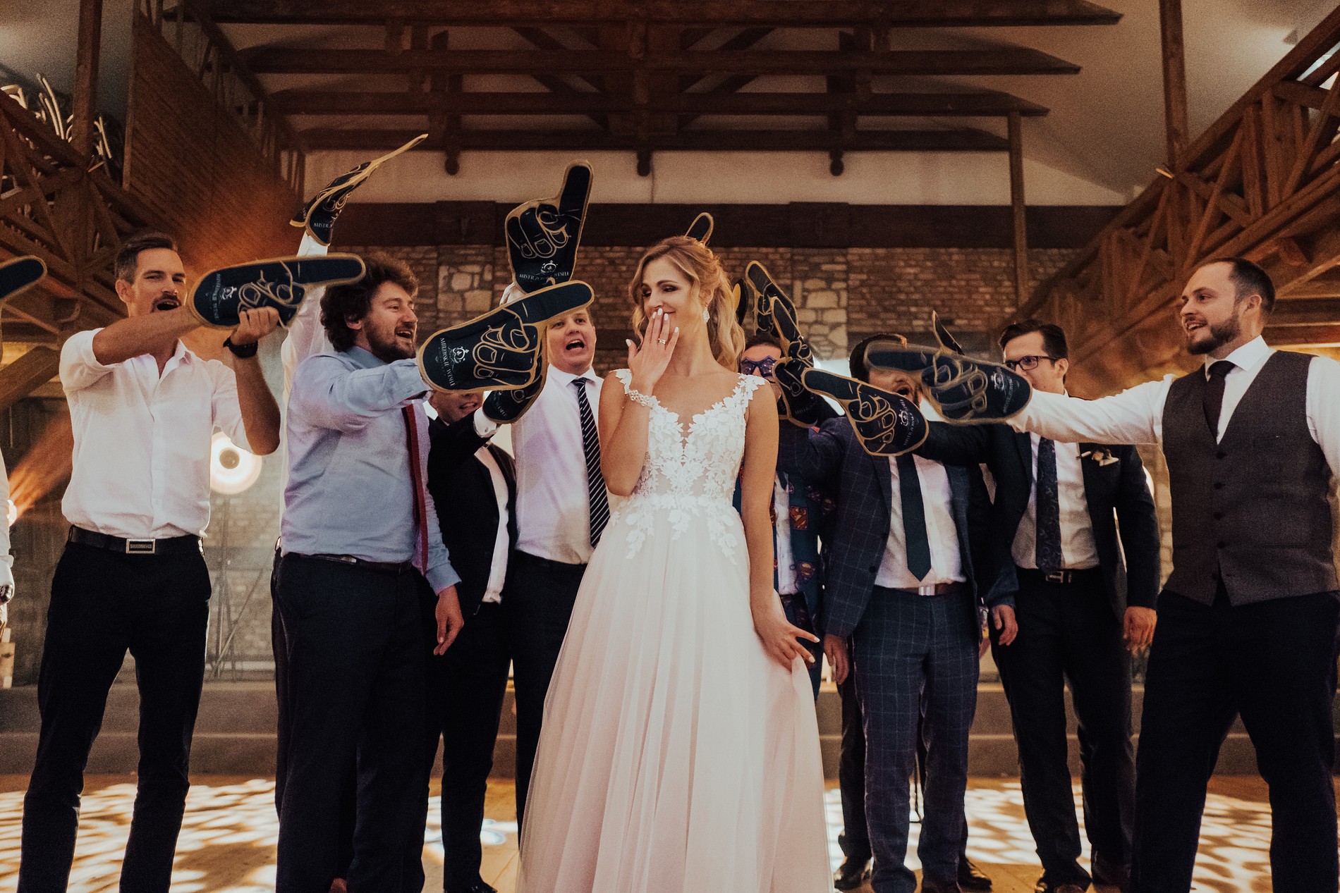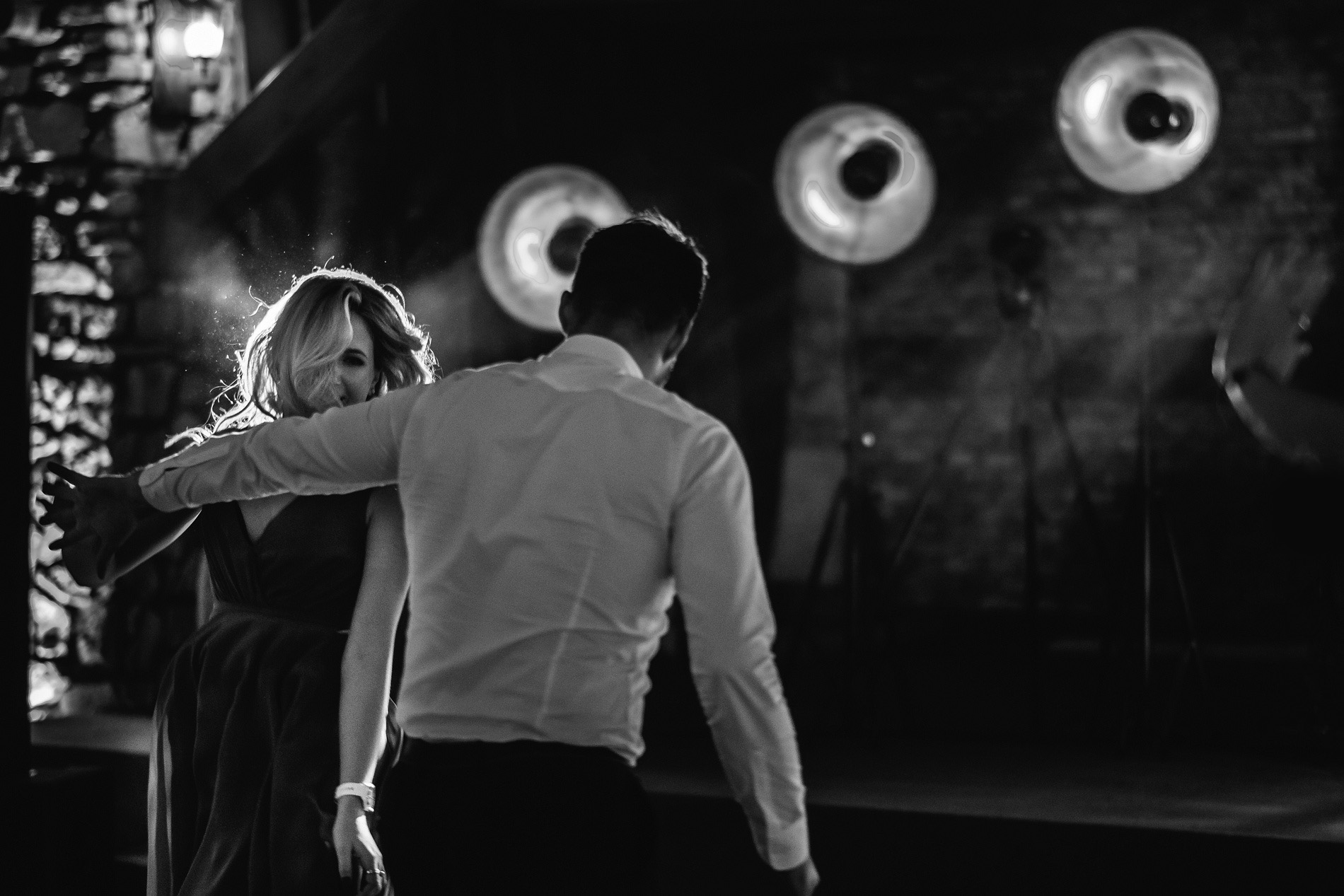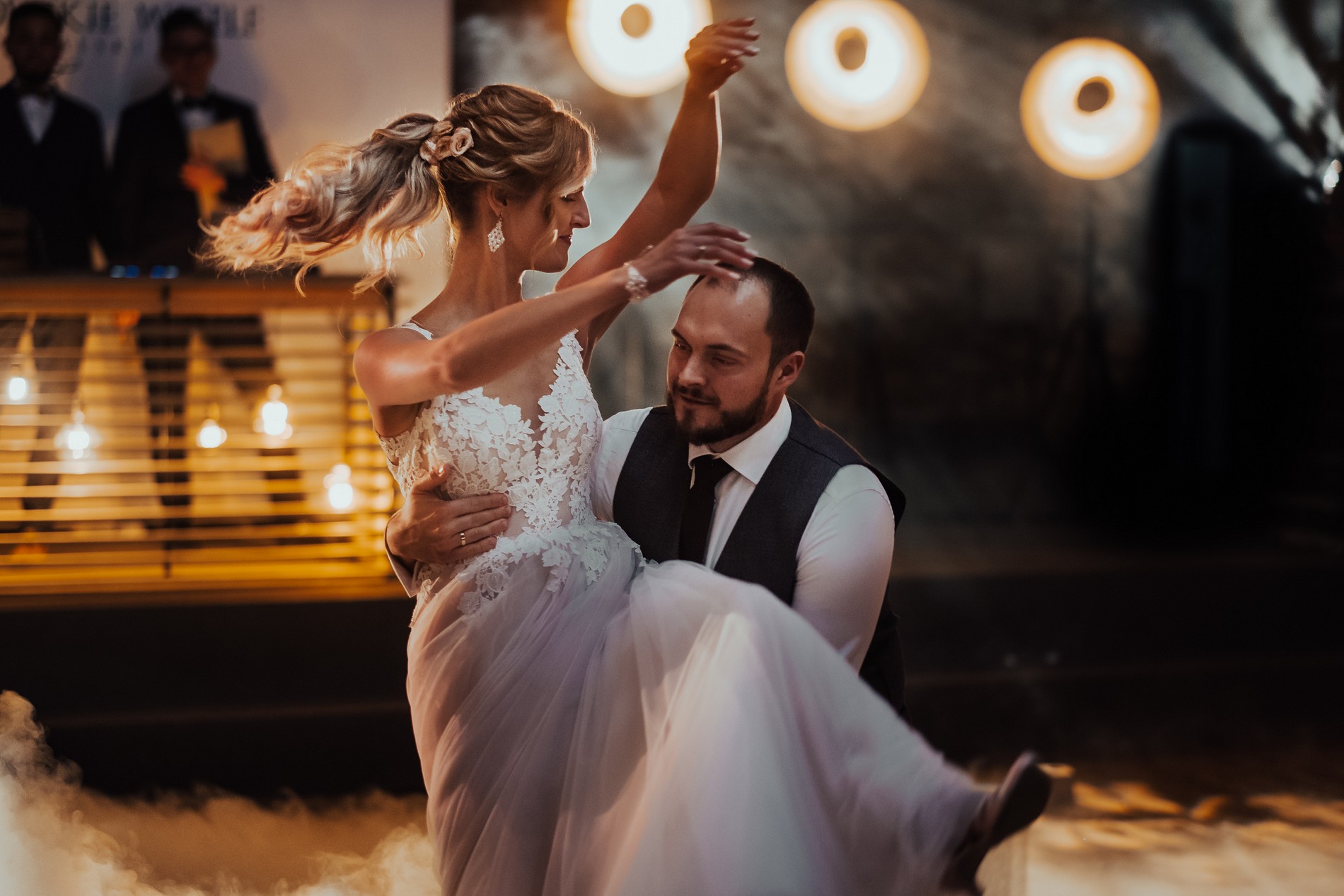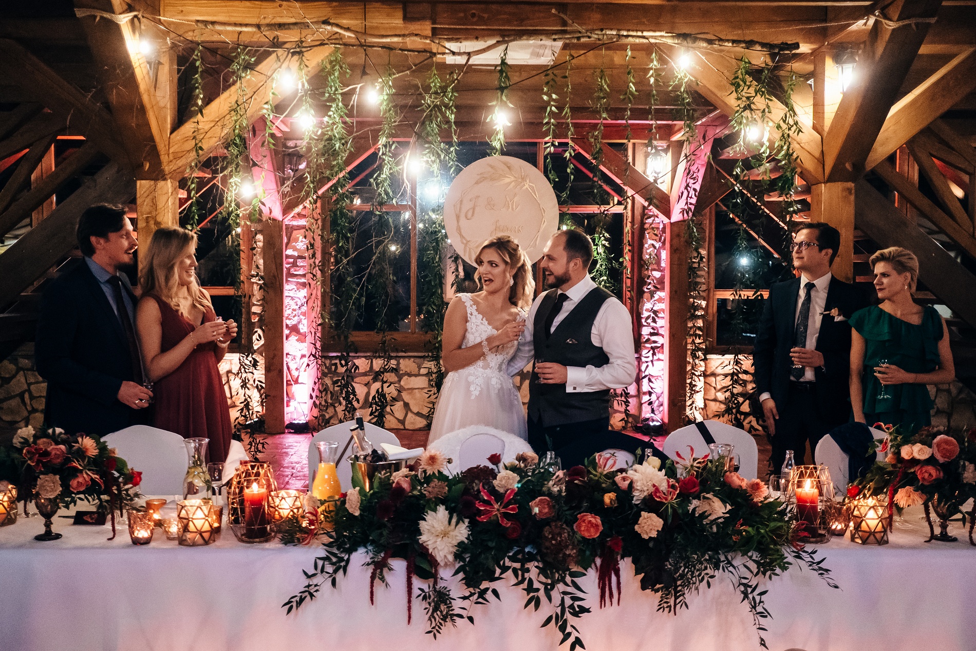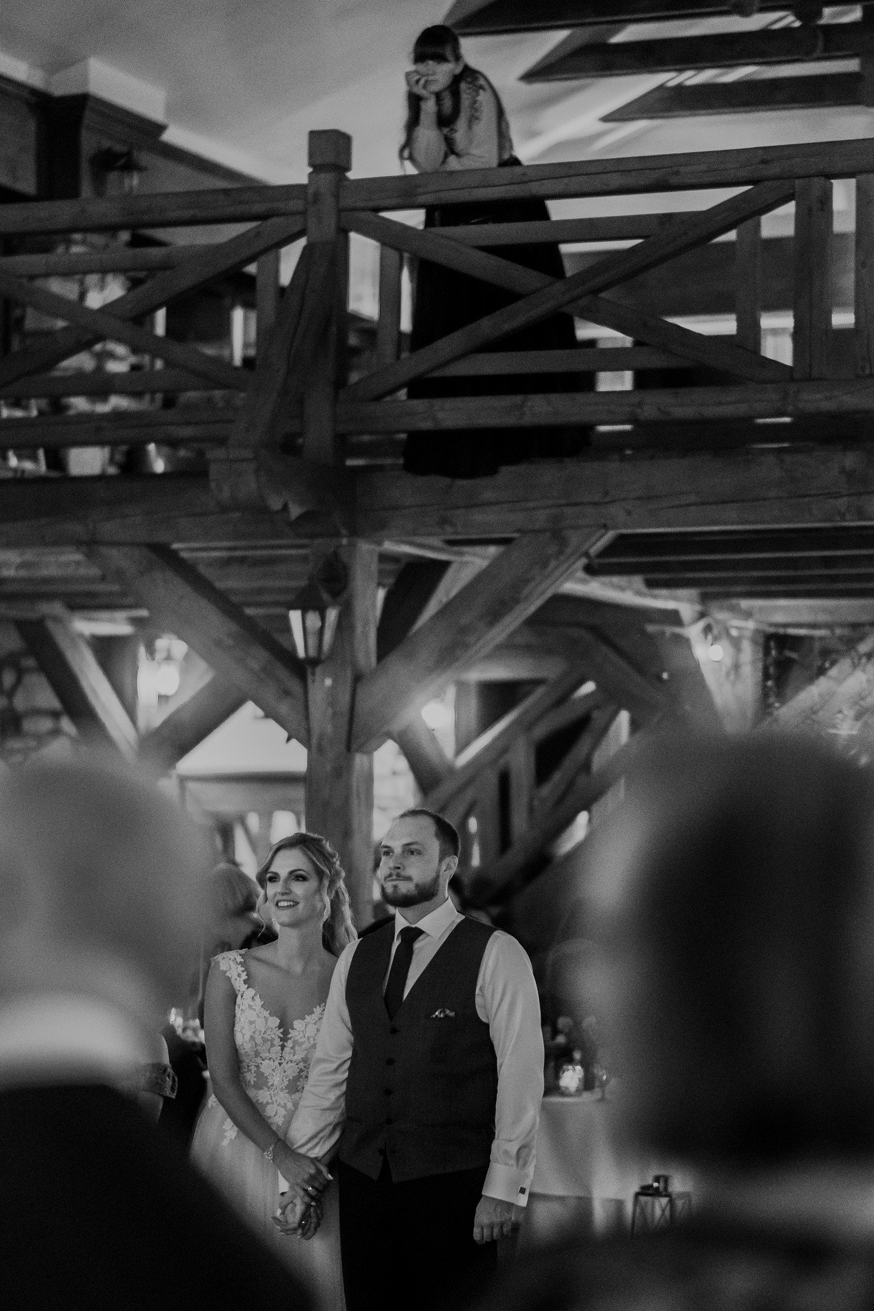 Po złożeniu przysięgi, nadszedł czas na świętowanie z bliskimi. Para Młoda zaprosiła Gości do Dworzyszcza Woli. Wnętrza w rustykalnym stylu, oświetlone świecami, wprowadzały ciepłą, rodzinną atmosferę, a jednocześnie zachwycały swoją subtelną elegancją. Para Młoda dała poznać się bliżej prezentując swoją historię w polaroidach rozwieszonych przy wejściu na salę weselną. Bajkową nutę wprowadził pierwszy taniec w chmurach.