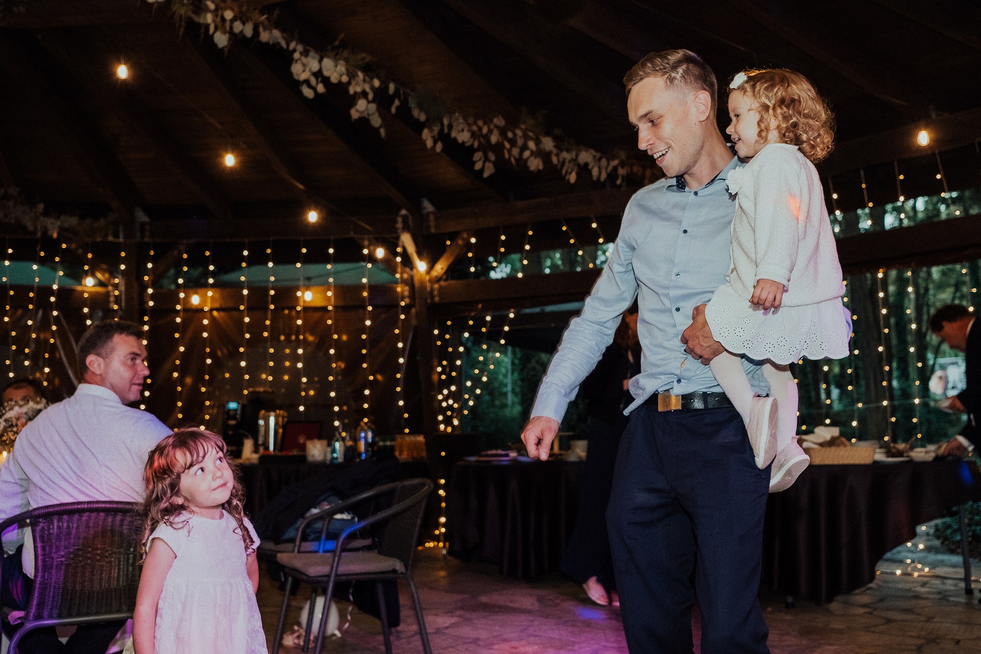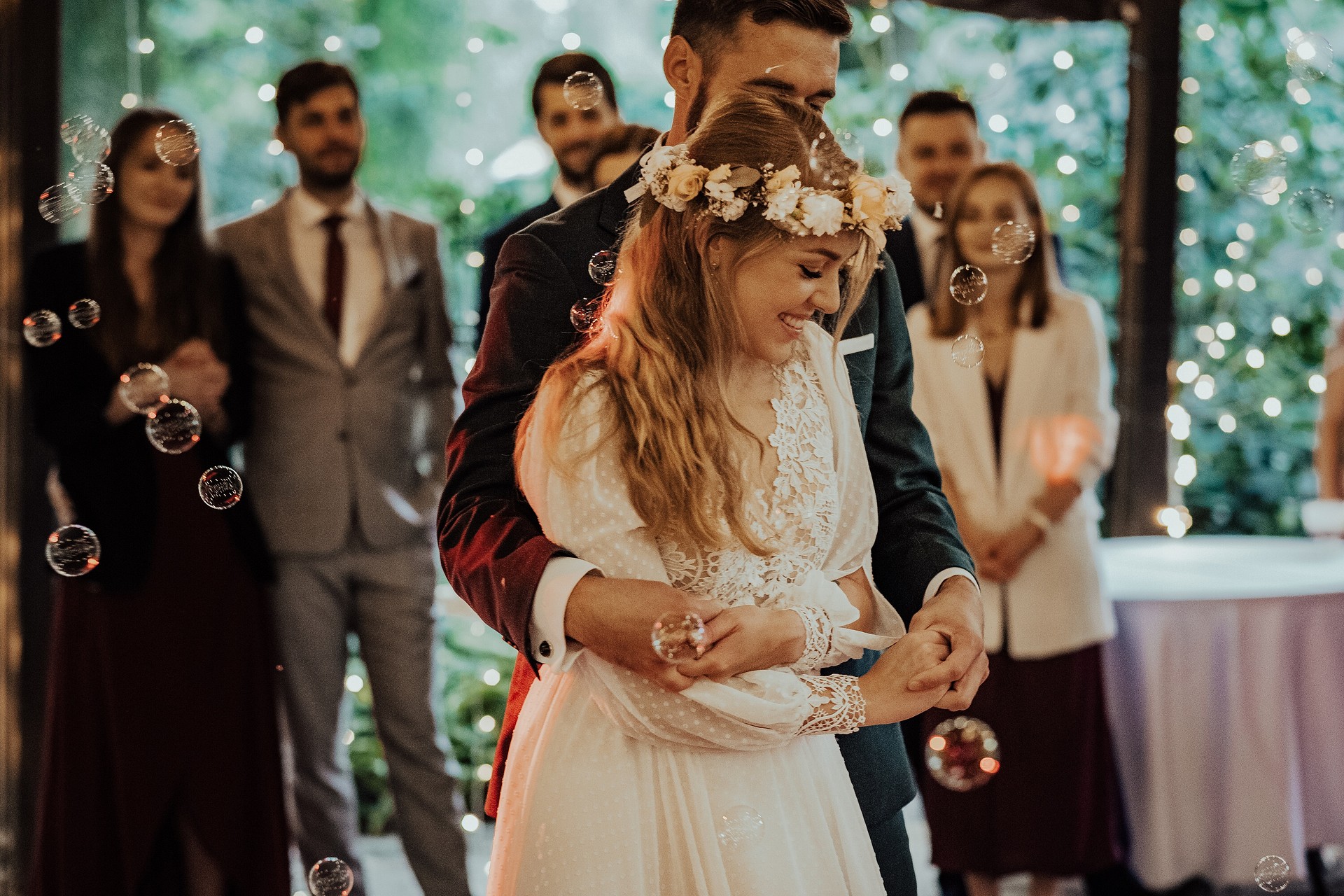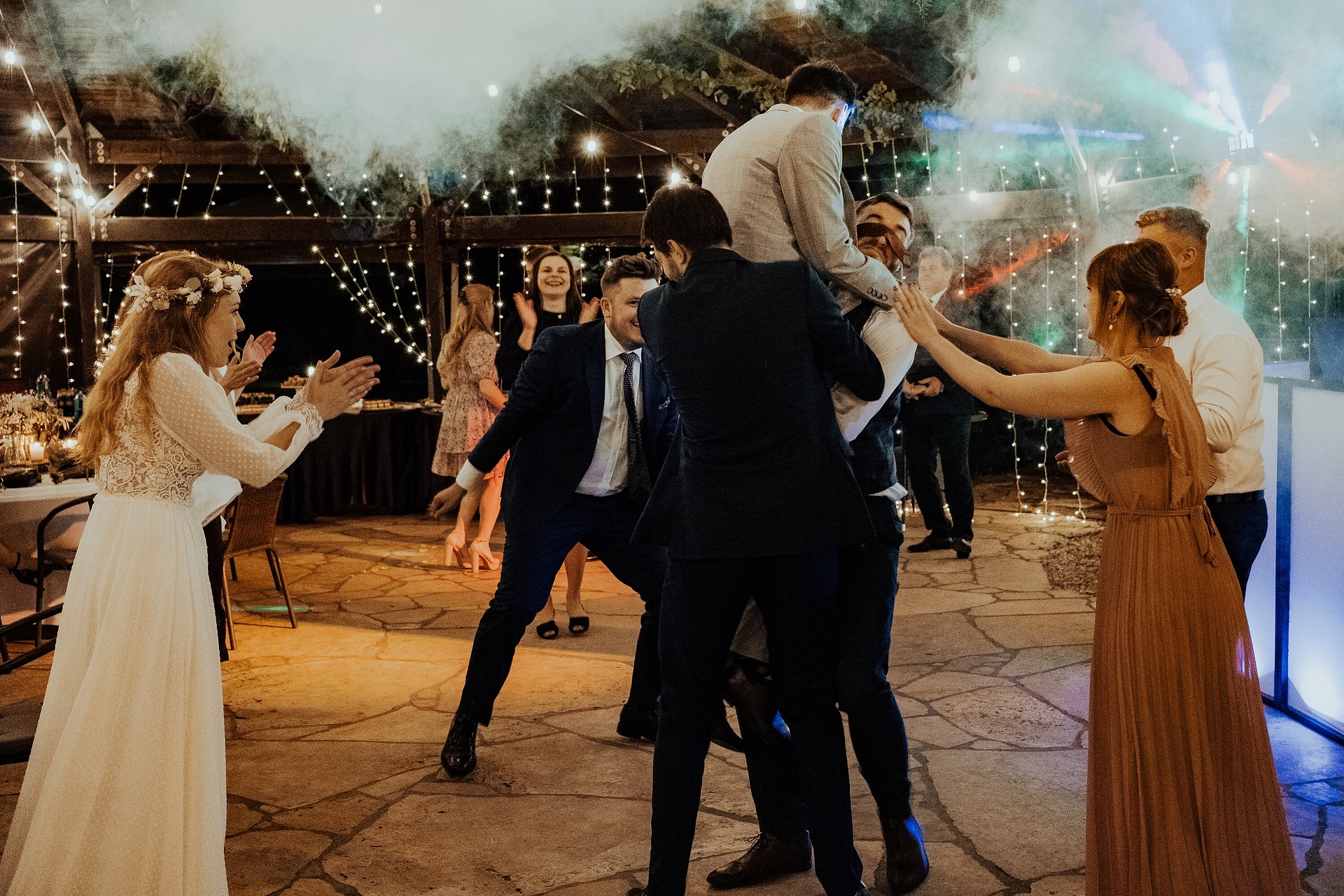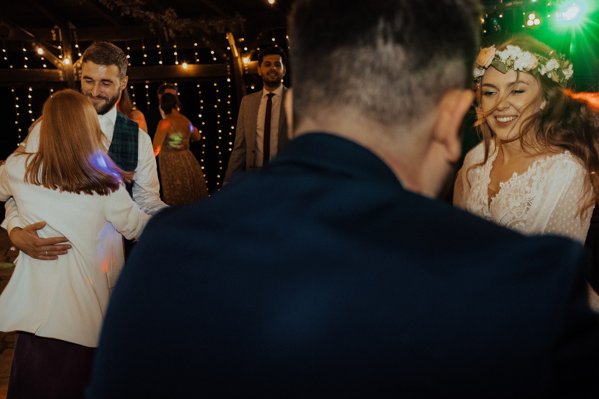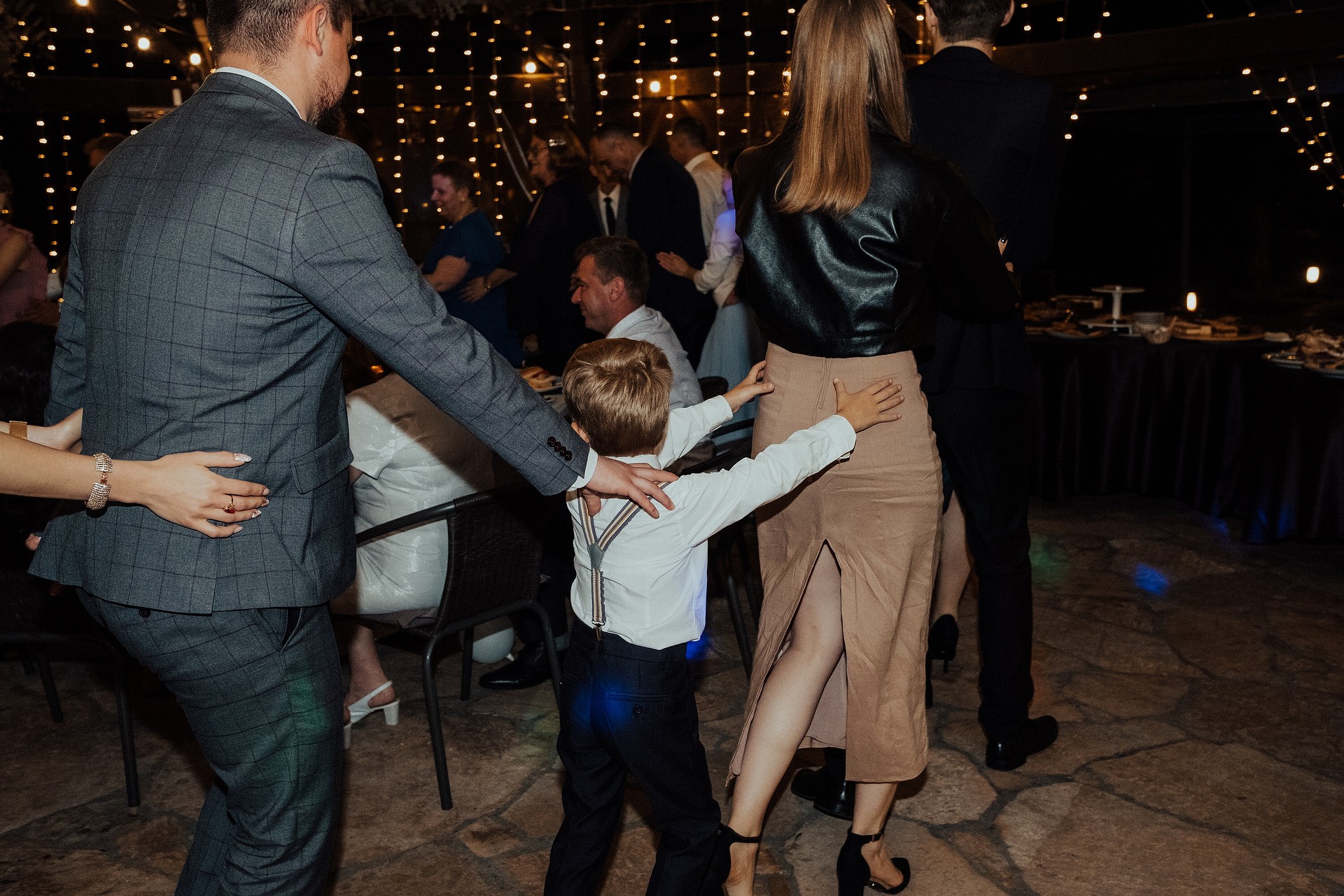 Wesele wypełniły szczere uśmiechy i beztroska radość. Po parkiecie biegały dzieci, dodając lekkości i spontaniczności całej zabawie, a goście z zaangażowaniem towarzyszyli Młodym w tańcach. Wśród gwaru i muzyki znalazła się też chwila tylko dla nich – krótka, kameralna mini sesja fotograficzna, podczas której mogli na moment pobyć sam na sam.