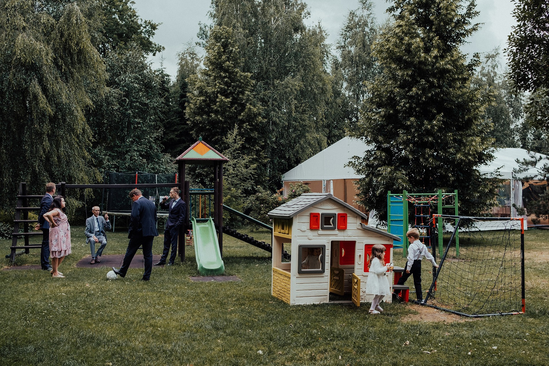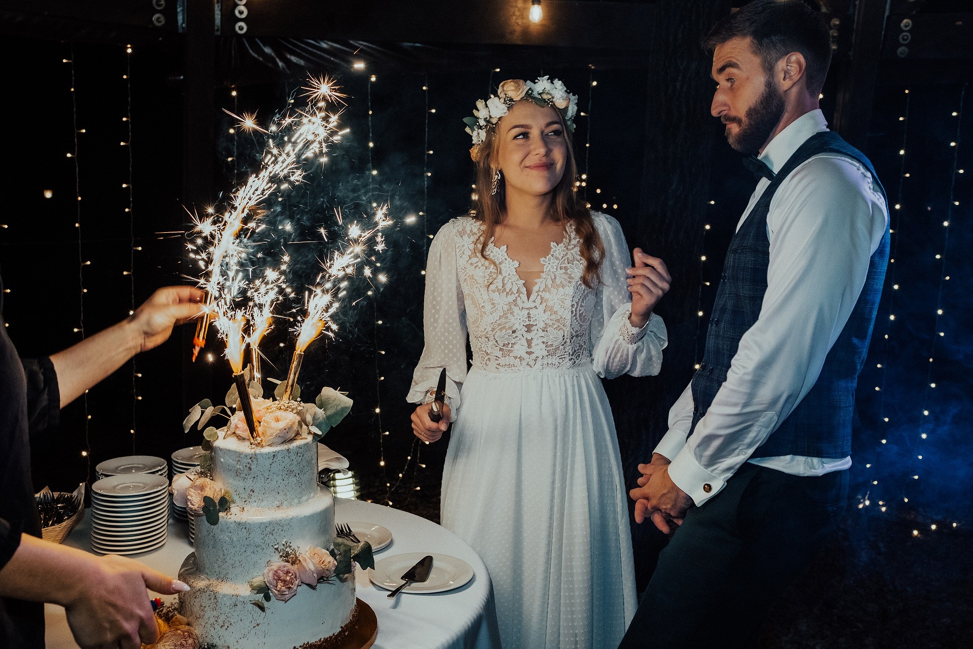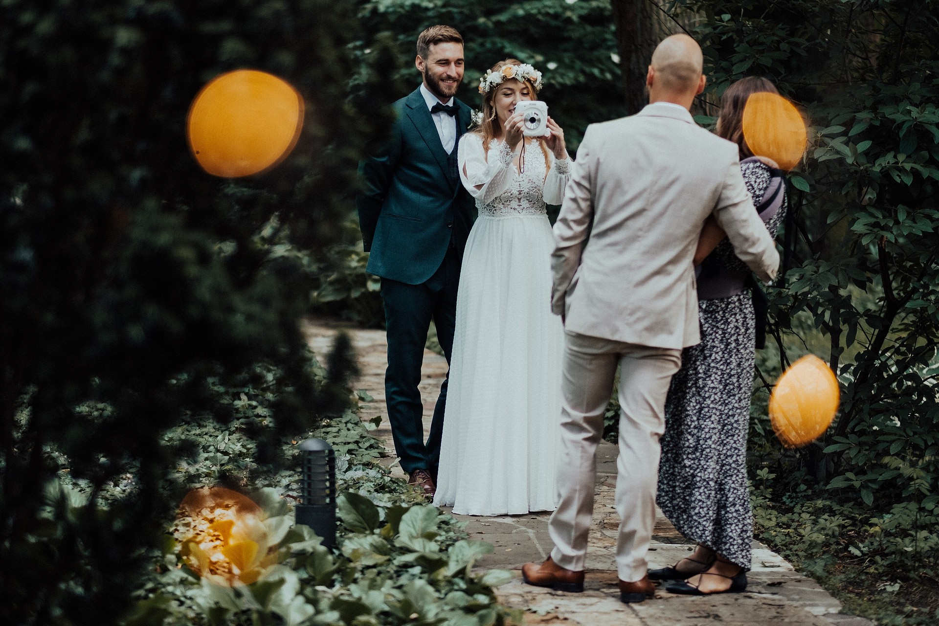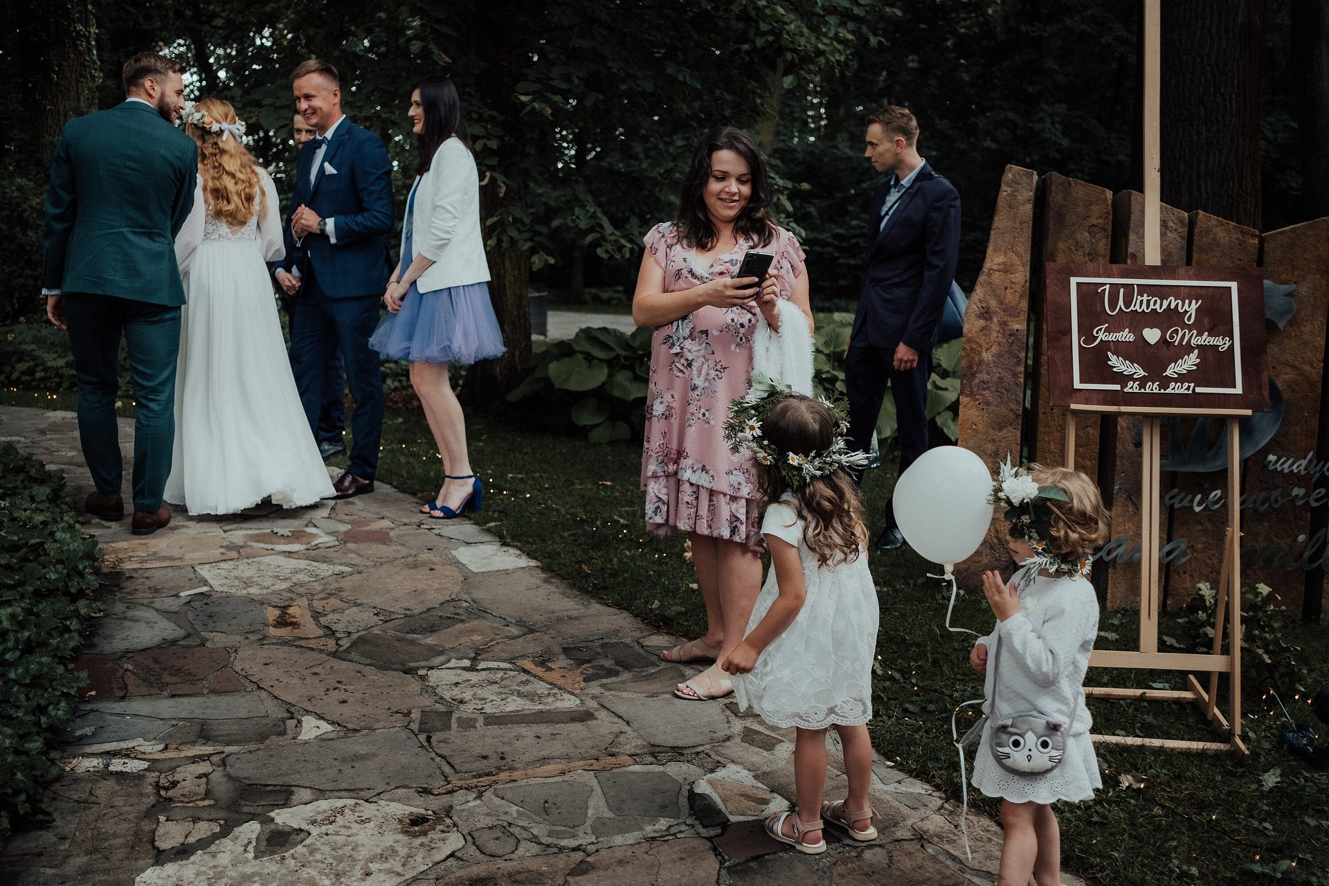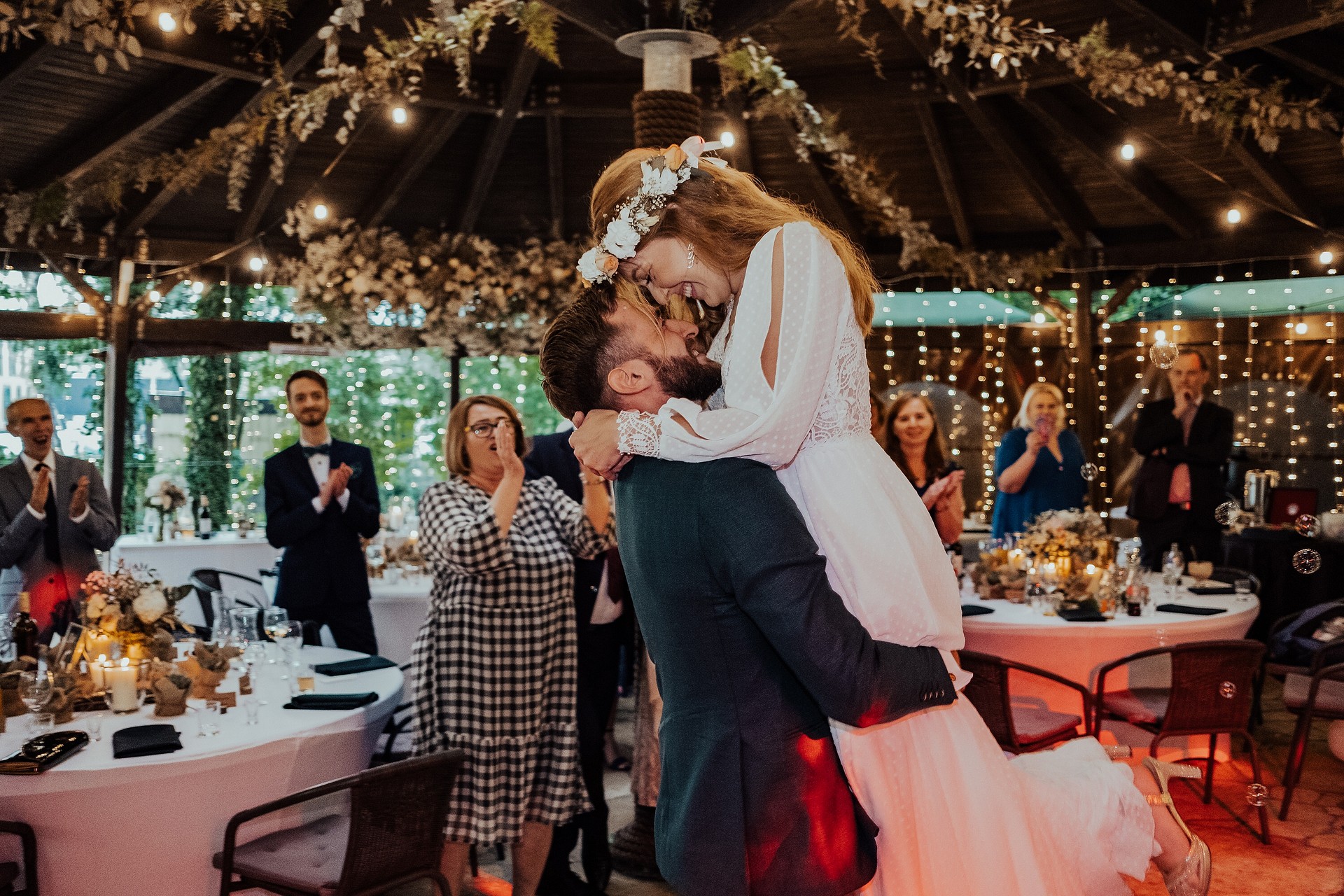 Wesele wypełniły szczere uśmiechy i beztroska radość. Po parkiecie biegały dzieci, dodając lekkości i spontaniczności całej zabawie, a goście z zaangażowaniem towarzyszyli Młodym w tańcach. Wśród gwaru i muzyki znalazła się też chwila tylko dla nich – krótka, kameralna mini sesja fotograficzna, podczas której mogli na moment pobyć sam na sam.