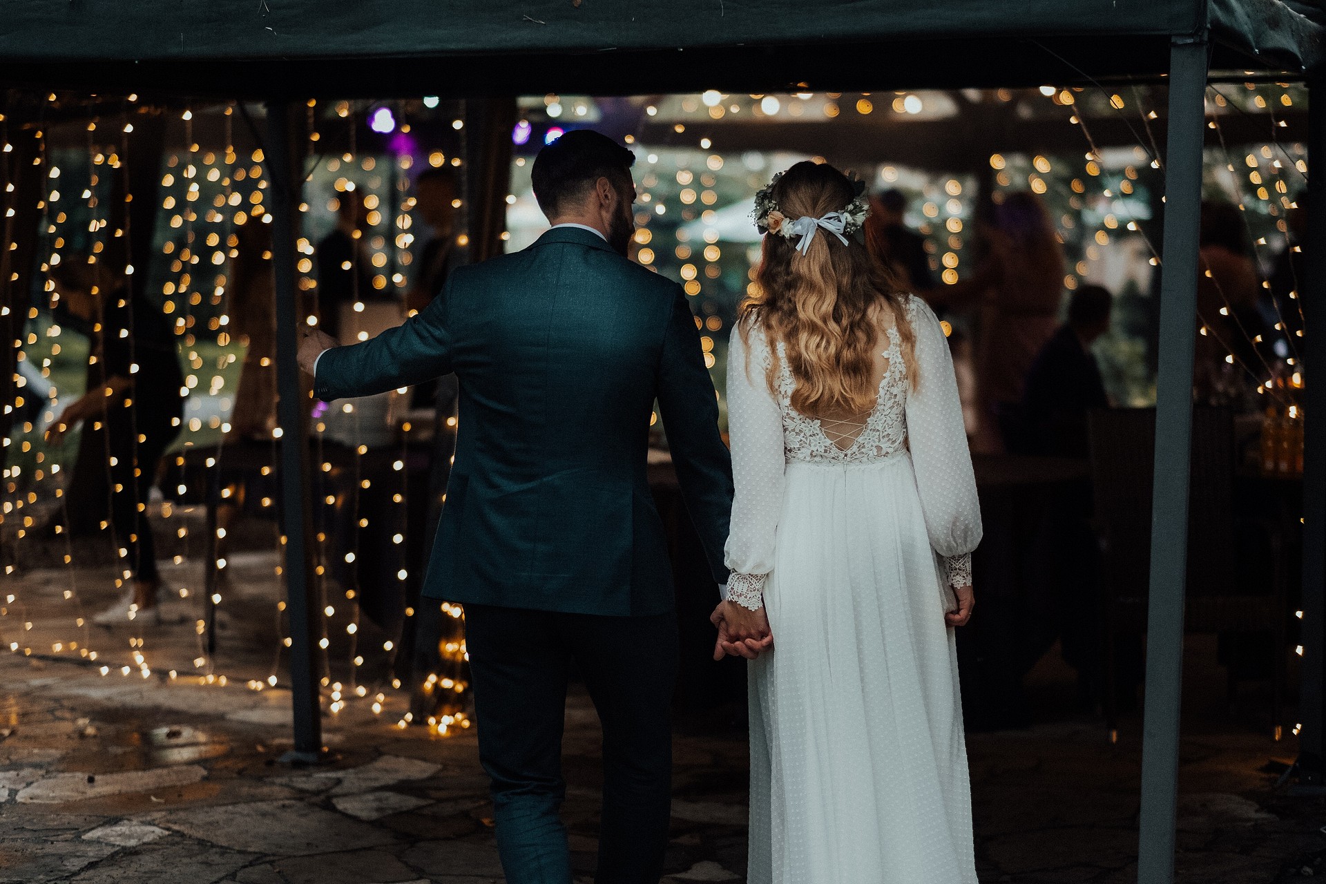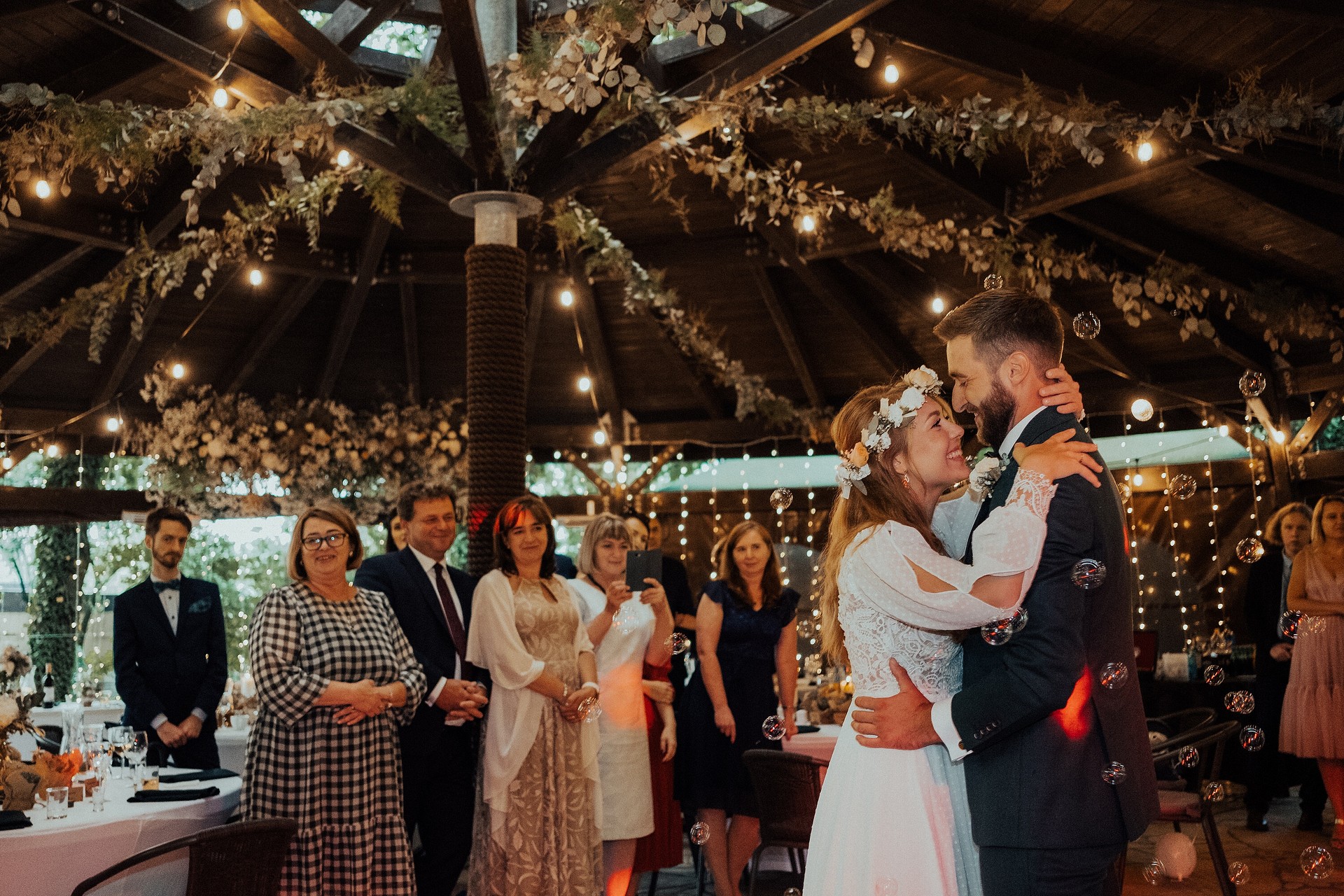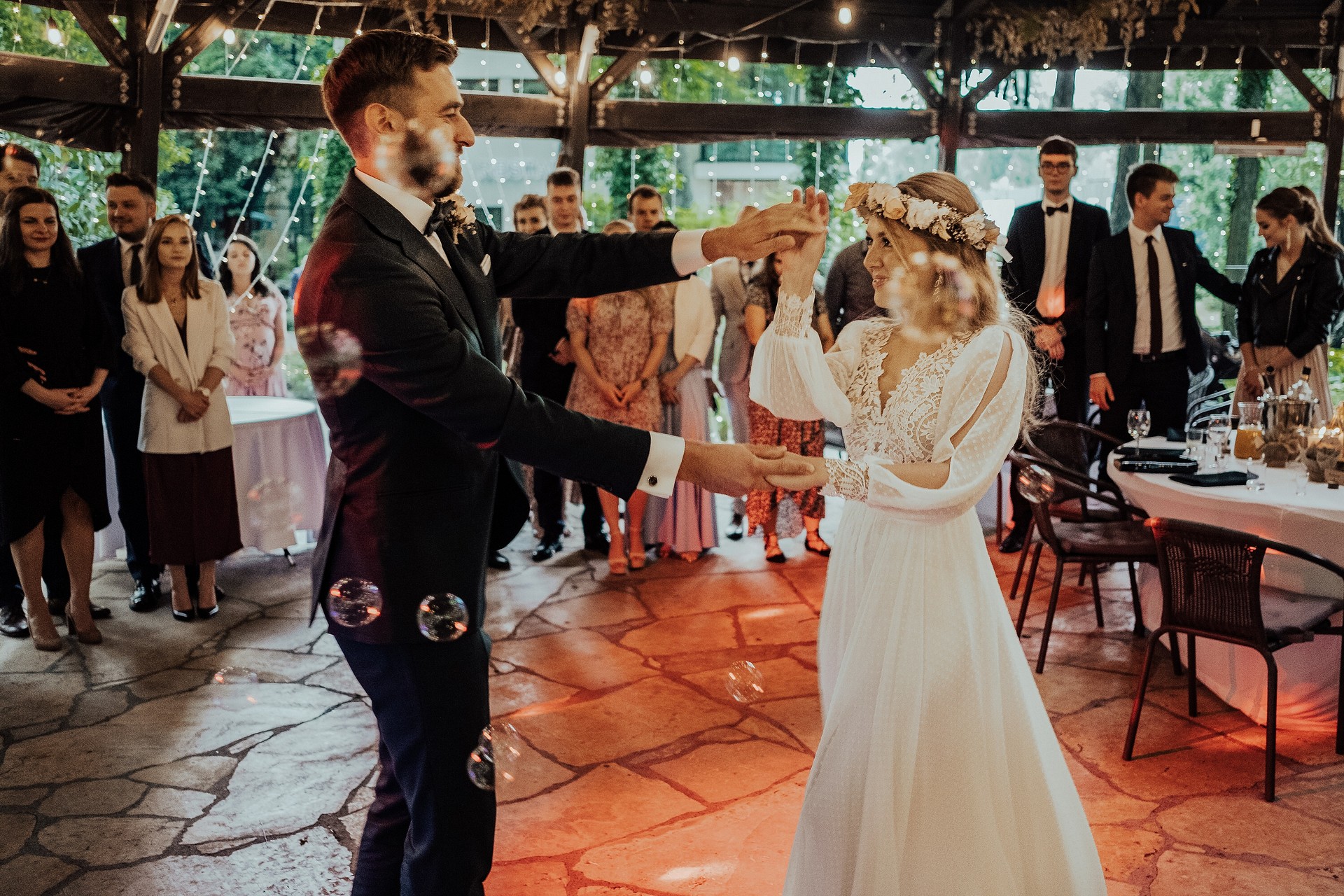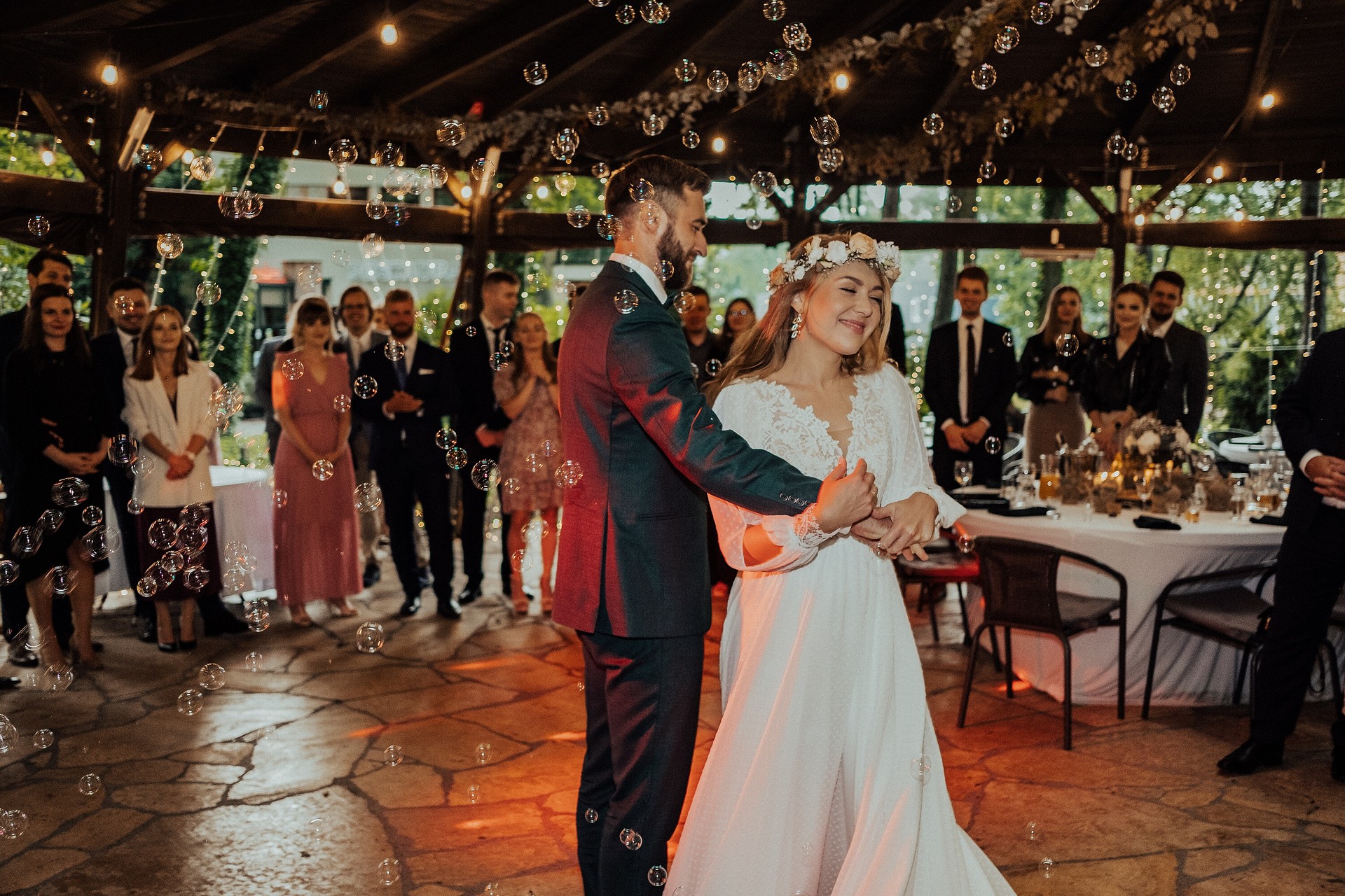 Na przyjęcie weselne Para Młoda zaprosiła swoich gości do Restauracji Magnifica w Krakowie. To miejsce zachwyca otoczeniem – zieleń, natura i elegancka przestrzeń tworzą idealne tło dla weselnych celebracji. Pierwszy taniec odbył się w blasku delikatnych światełek, które nadały tej chwili bajkowego klimatu.
