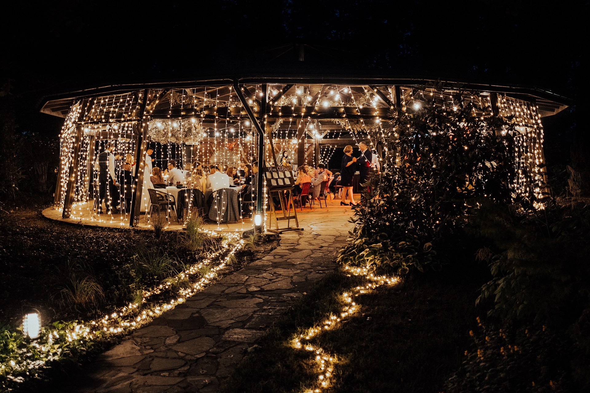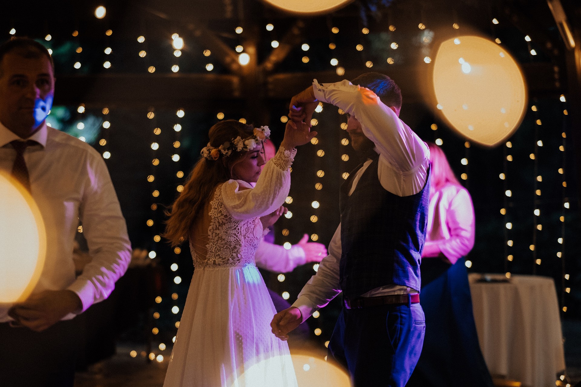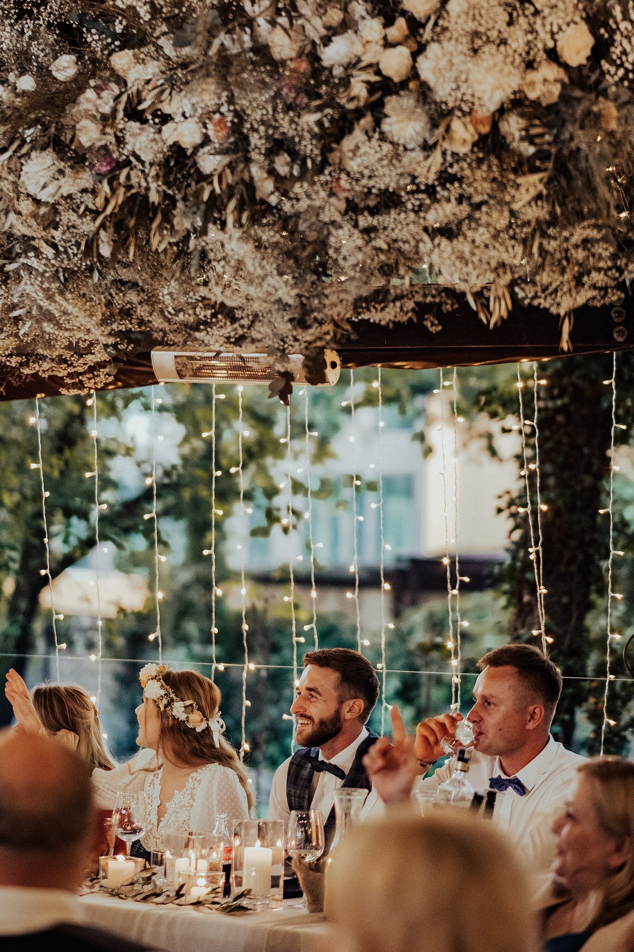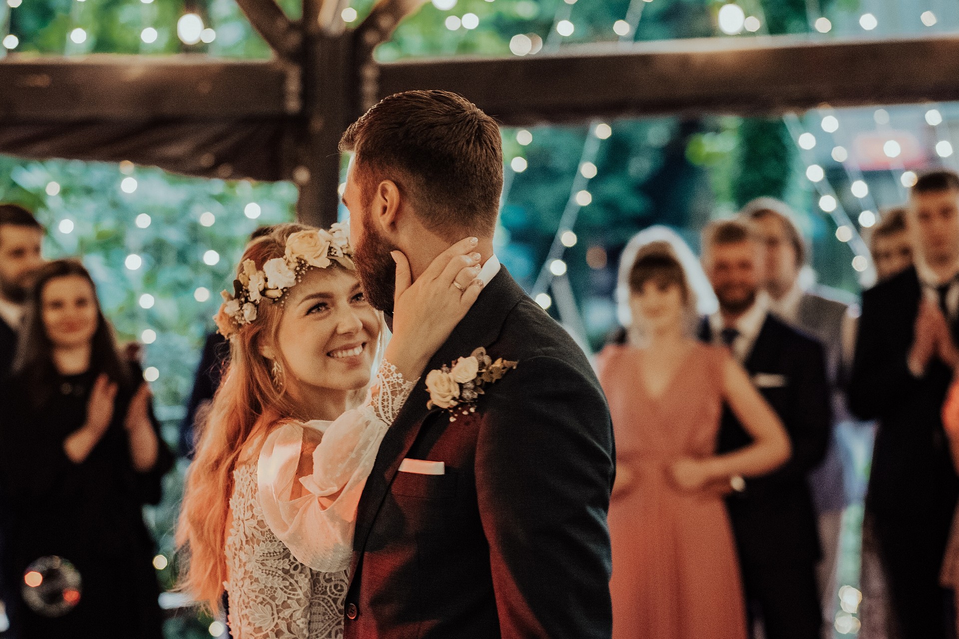 Na przyjęcie weselne Para Młoda zaprosiła swoich gości do Restauracji Magnifica w Krakowie. To miejsce zachwyca otoczeniem – zieleń, natura i elegancka przestrzeń tworzą idealne tło dla weselnych celebracji. Pierwszy taniec odbył się w blasku delikatnych światełek, które nadały tej chwili bajkowego klimatu.