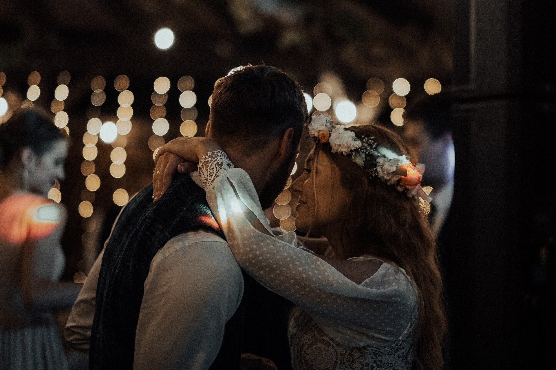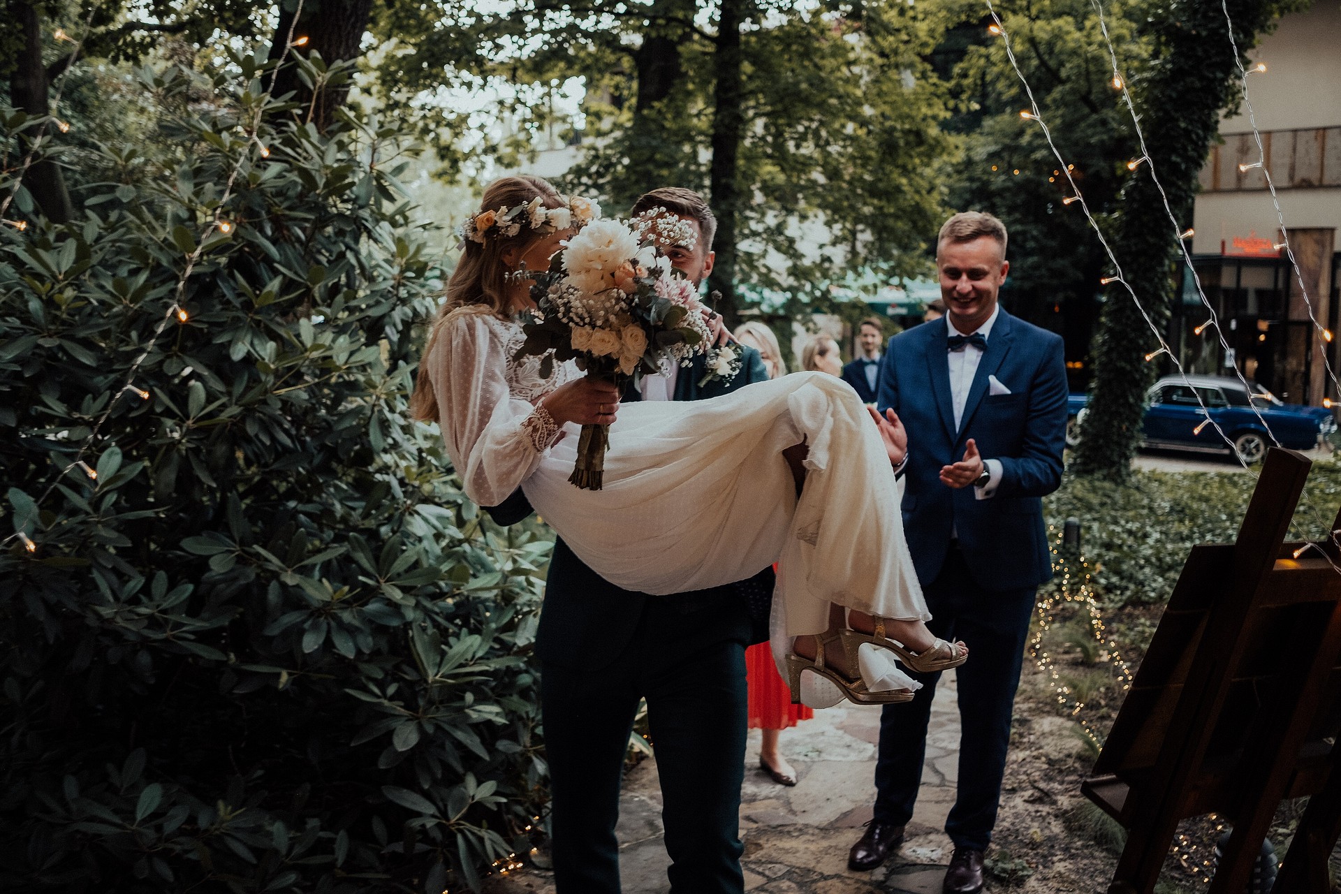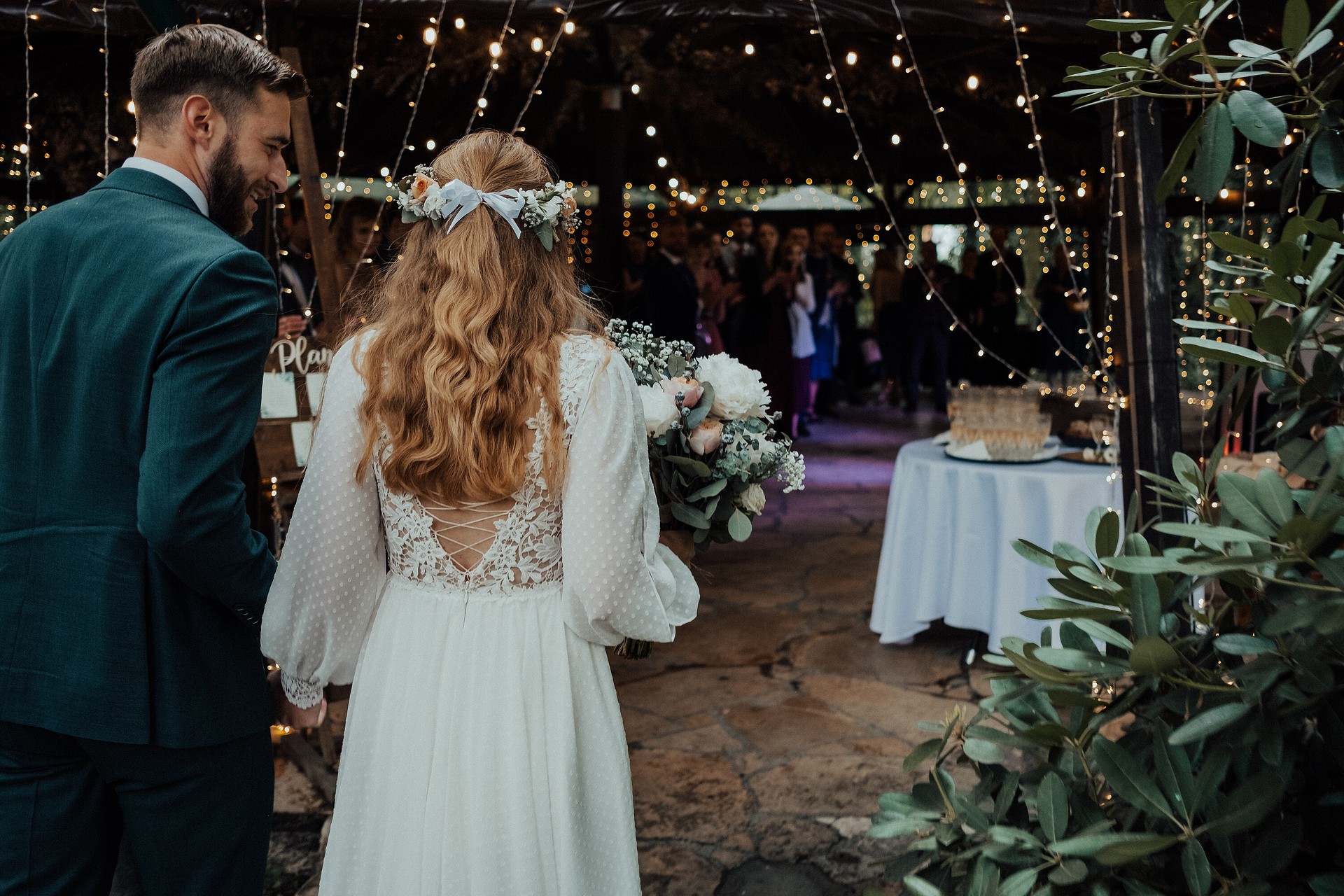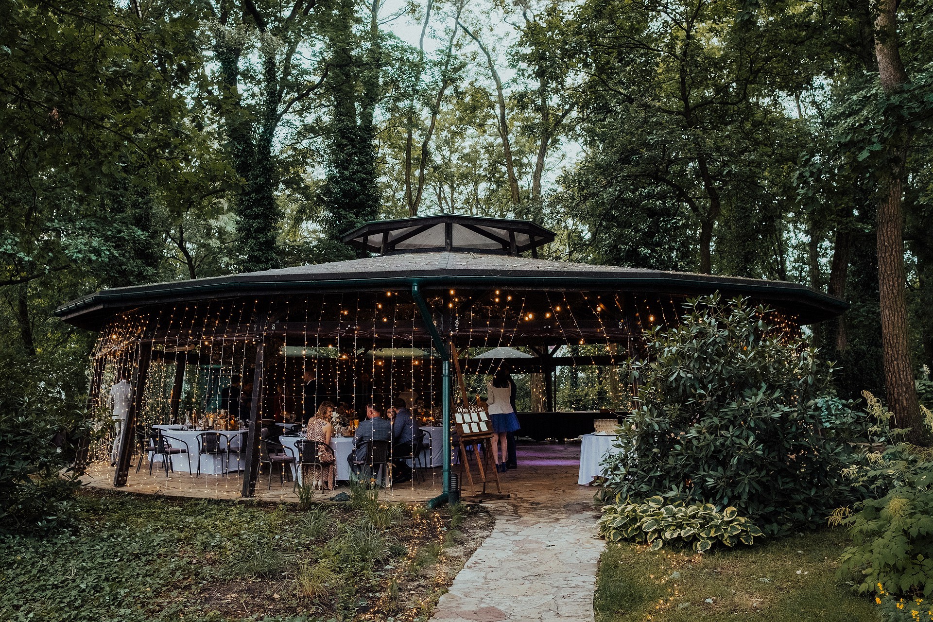 Na przyjęcie weselne Para Młoda zaprosiła swoich gości do Restauracji Magnifica w Krakowie. To miejsce zachwyca otoczeniem – zieleń, natura i elegancka przestrzeń tworzą idealne tło dla weselnych celebracji. Pierwszy taniec odbył się w blasku delikatnych światełek, które nadały tej chwili bajkowego klimatu.